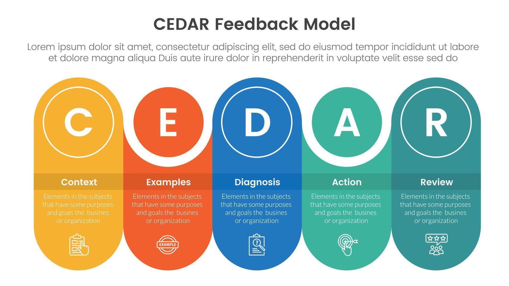 CEDAR feedback model infographic template banner with round rectangle with circle combination timeline with 5 point list information for slide presentation vector