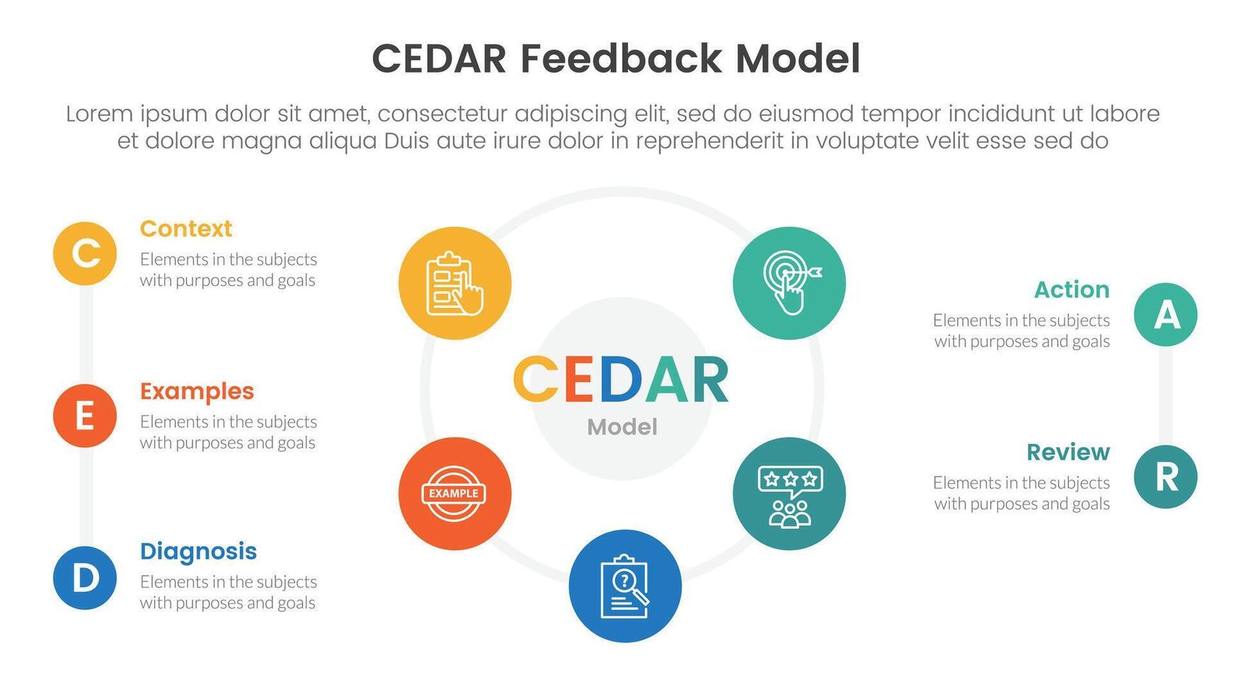 CEDAR feedback model infographic template banner with big cirlce shape circular cycle on center with circle badge with 5 point list information for slide presentation Pro Vector