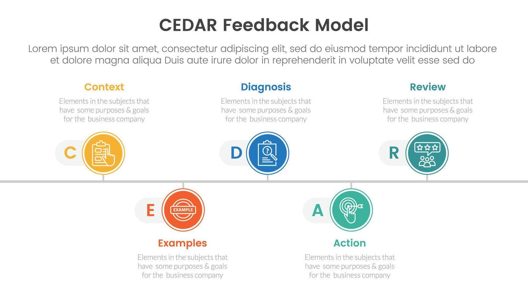 CEDAR feedback model infographic template banner with timeline circle point right direction with circle badge with 5 point list information for slide presentation vector