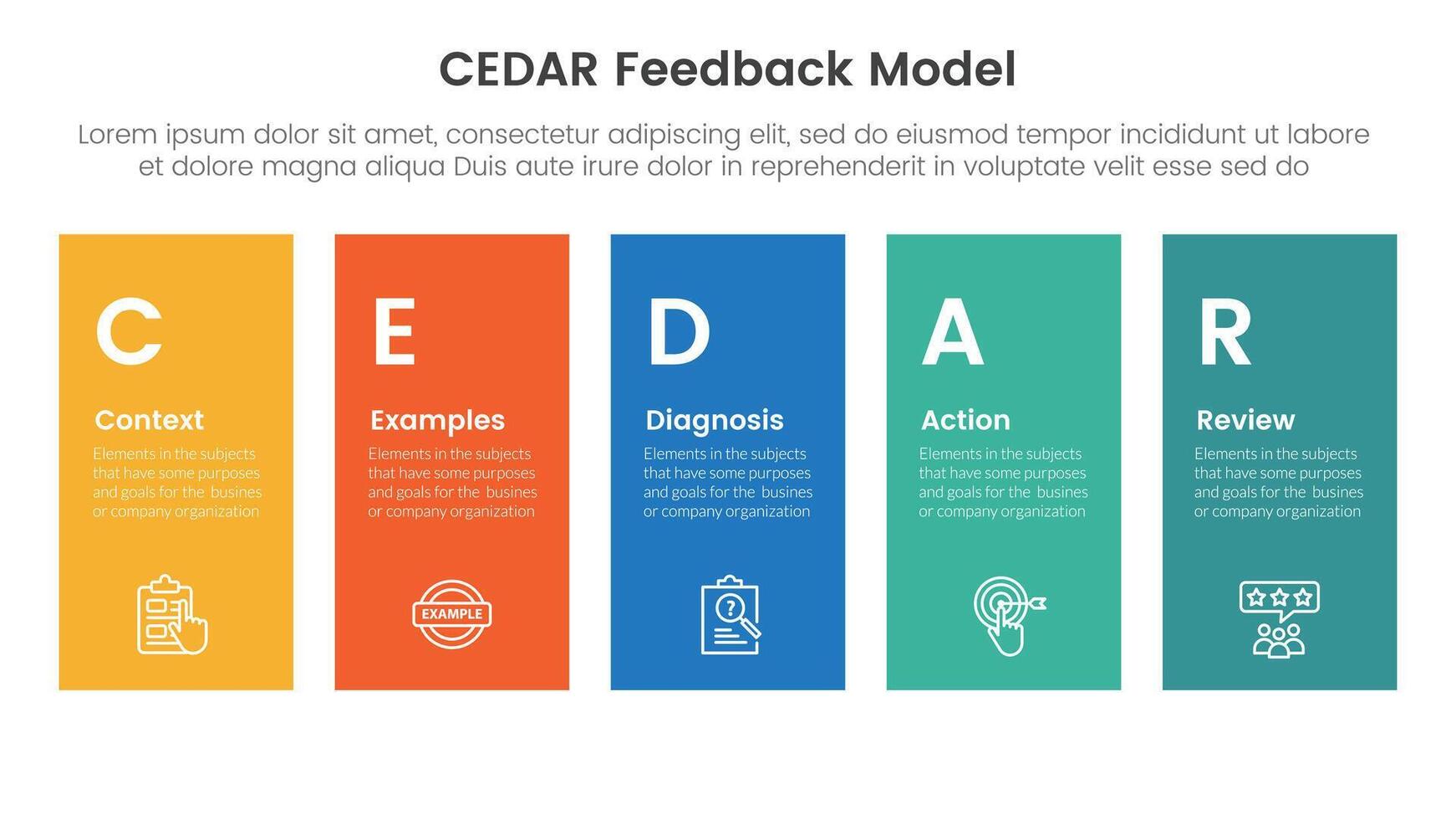 CEDAR feedback model infographic template banner with height rectangle shape balance with 5 point list information for slide presentation vector