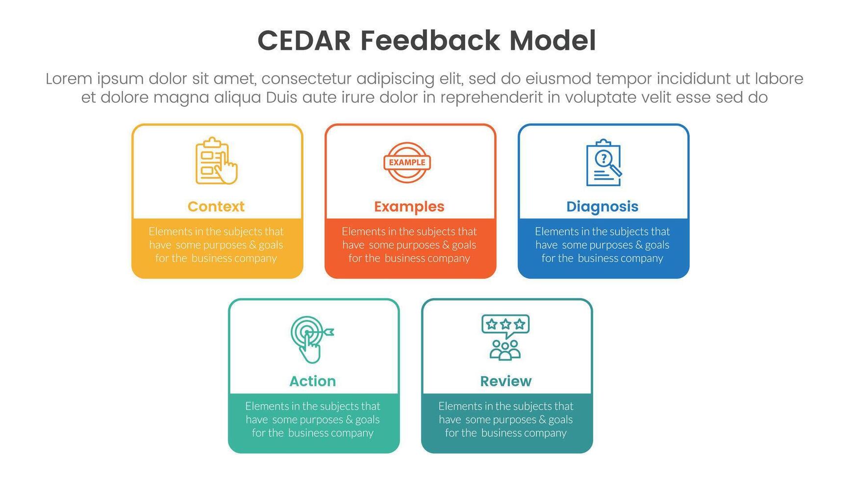 CEDAR feedback model infographic template banner with square rectangle box outline with circle badge with 5 point list information for slide presentation vector