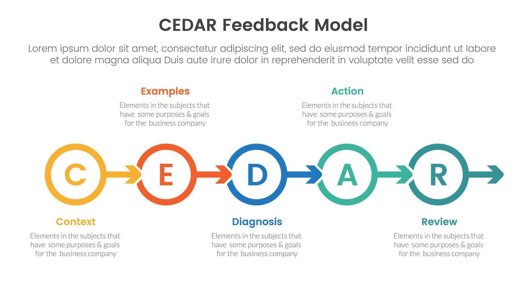 CEDAR feedback model infographic template banner with outline circle arrow right direction with 5 point list information for slide presentation vector