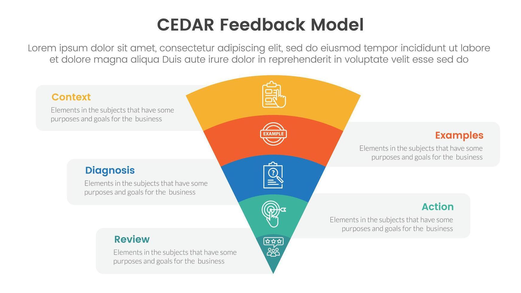 CEDAR feedback model infographic template banner with funnel bending on center with 5 point list information for slide presentation Pro Vector
