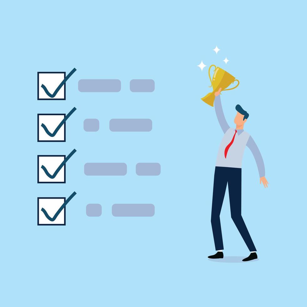 Checklist for completed tasks, businessman with a cup next to him who completed the checklist. Pro Vector