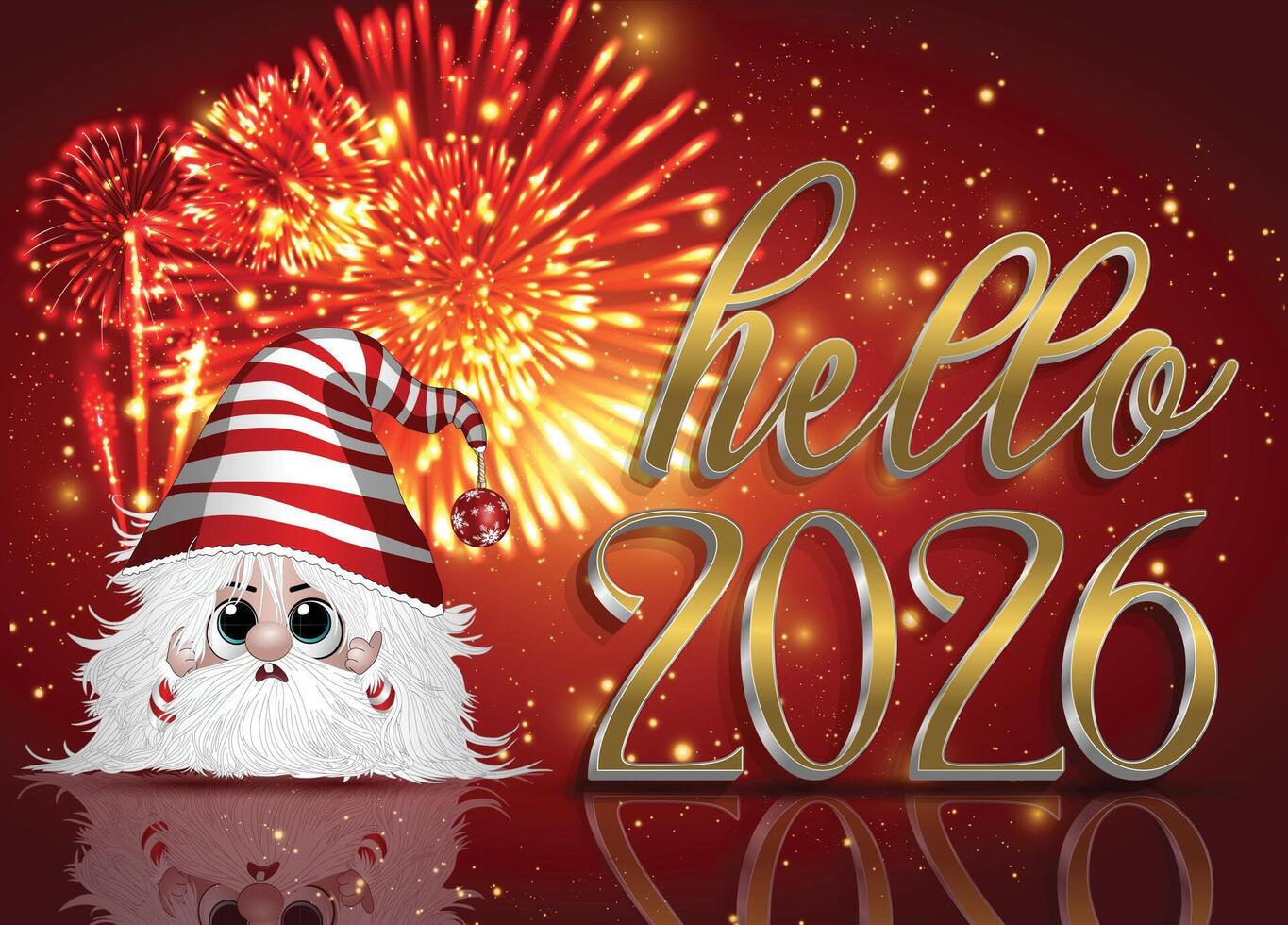 Adorable gnome standing next to Hello 2026, with shimmering golden fireworks set against a red backdrop. Pro Vector