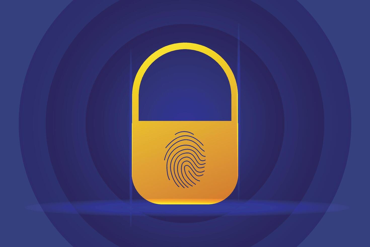 padlock with biometric fingerprint. Dynamic design to illustrate modern cybersecurity and protection systems. Pro Vector