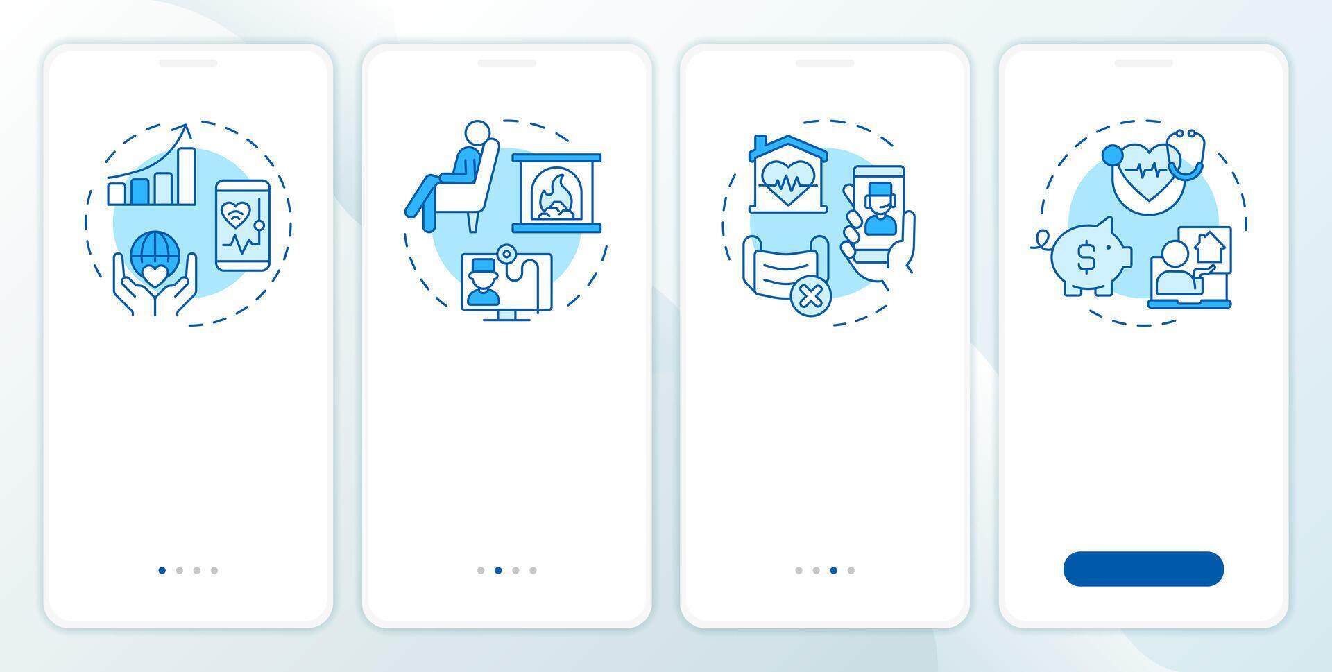 Benefits of telehealth blue onboarding mobile app screen. Walkthrough 4 steps editable graphic instructions with linear concepts. UI, UX, GUI template Pro Vector