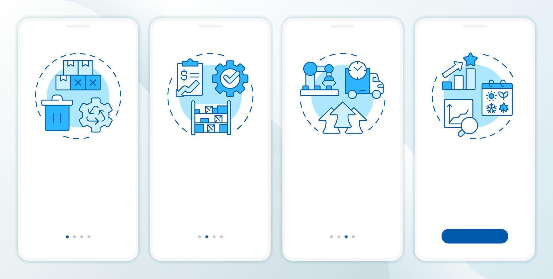 Benefits of MRP II blue onboarding mobile app screen. Manufacture. Walkthrough 4 steps editable graphic instructions with linear concepts. UI, UX, GUI template Pro Vector