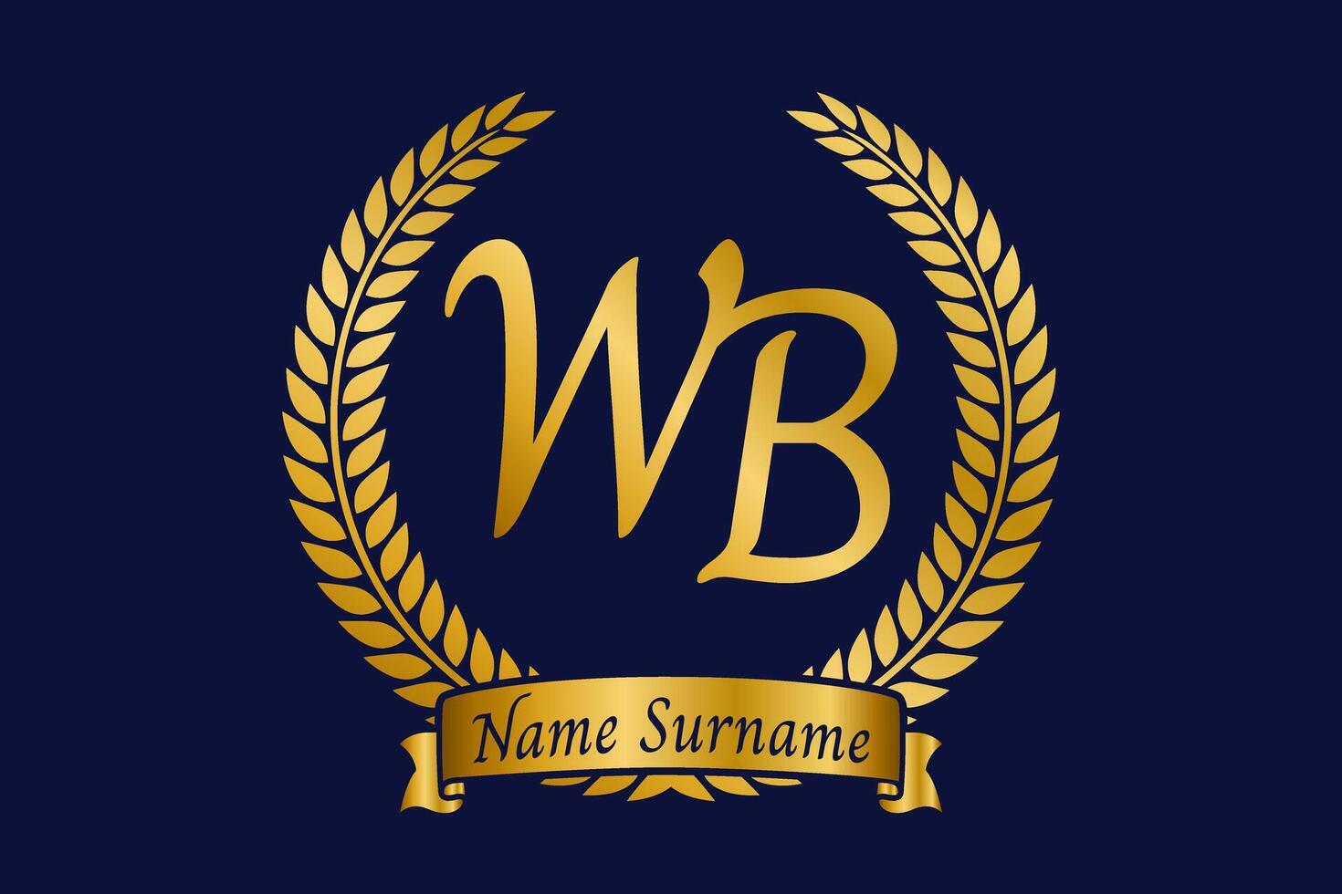 Elegant gold WB monogram encircled by laurel wreath, featuring a customizable name banner. Perfect for branding, invitations, and luxury designs. Adds sophistication and prestige to any project. Pro Vector