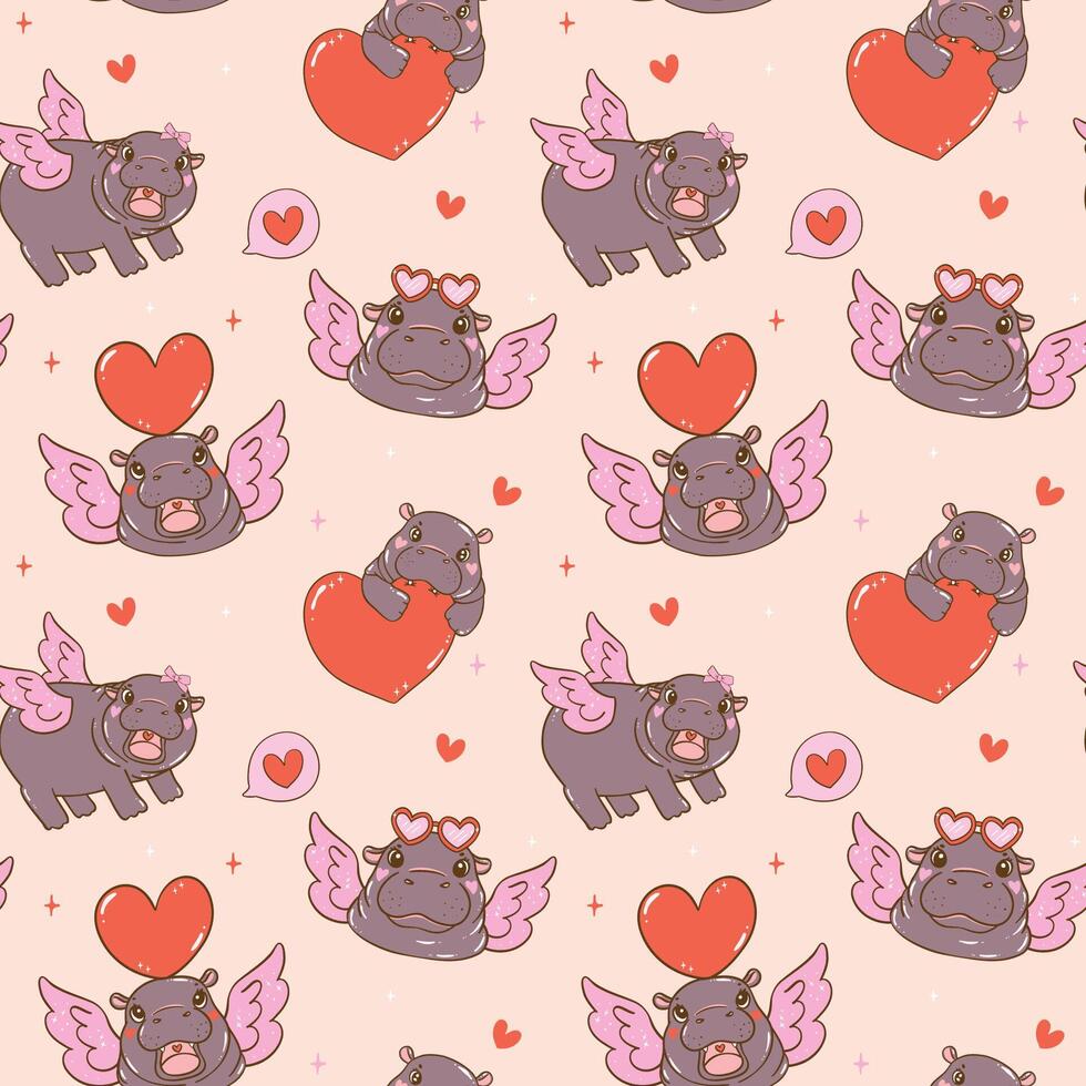 Retro Valentine Moo Deng Seamless Pattern Baby Pygmy Hippo isolated on background Pro Vector