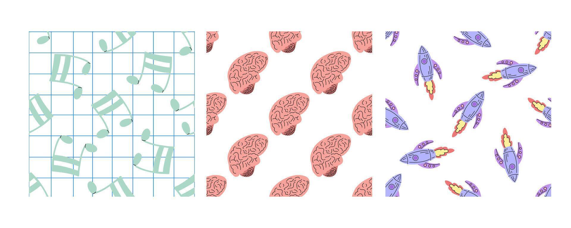 Seamless patterns with music notes, brains, and rockets in flat doodle style Pro Vector