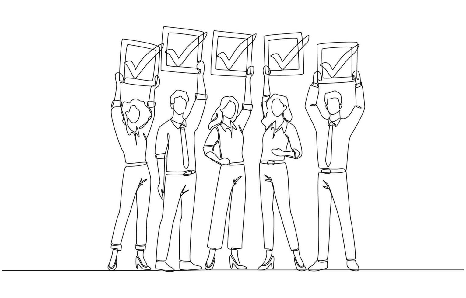 Continuous one line drawing of business team holding completed checkboxes, teamwork and project success, mission accomplished team concept, single line art Pro Vector