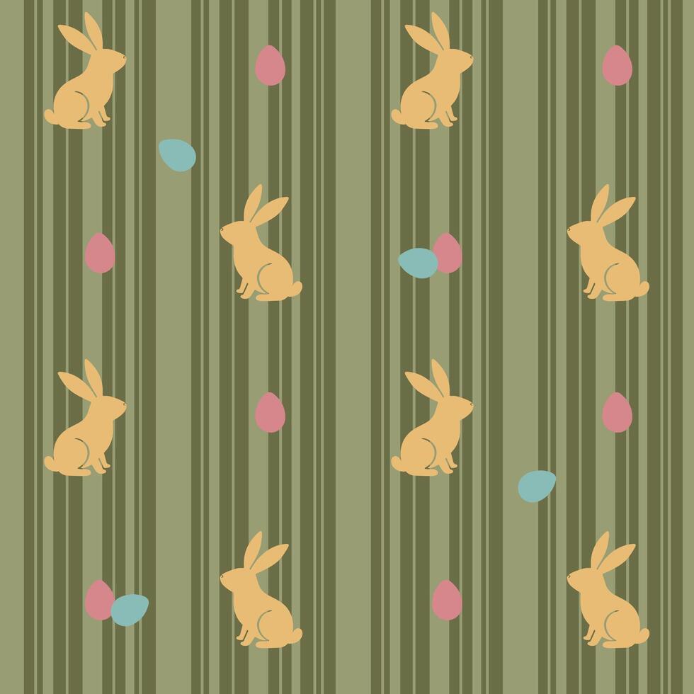 Easter pattern with rabbits, Easter eggs and vertical stripes on a green background Pro Vector