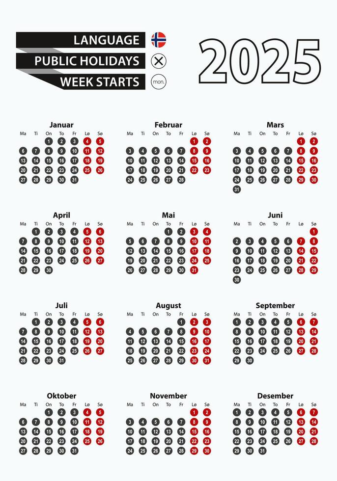 Template calendar 2025 with number in circles, simple Norwegian calendar for year 2025. Pro Vector