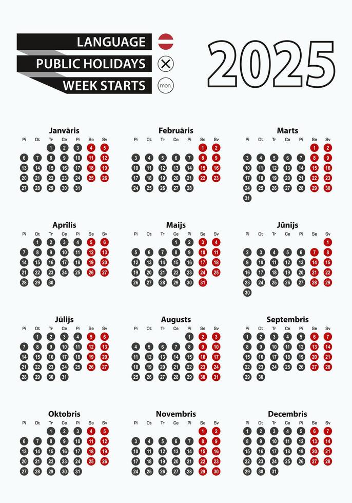 Template calendar 2025 with number in circles, simple Latvian calendar for year 2025. Pro Vector