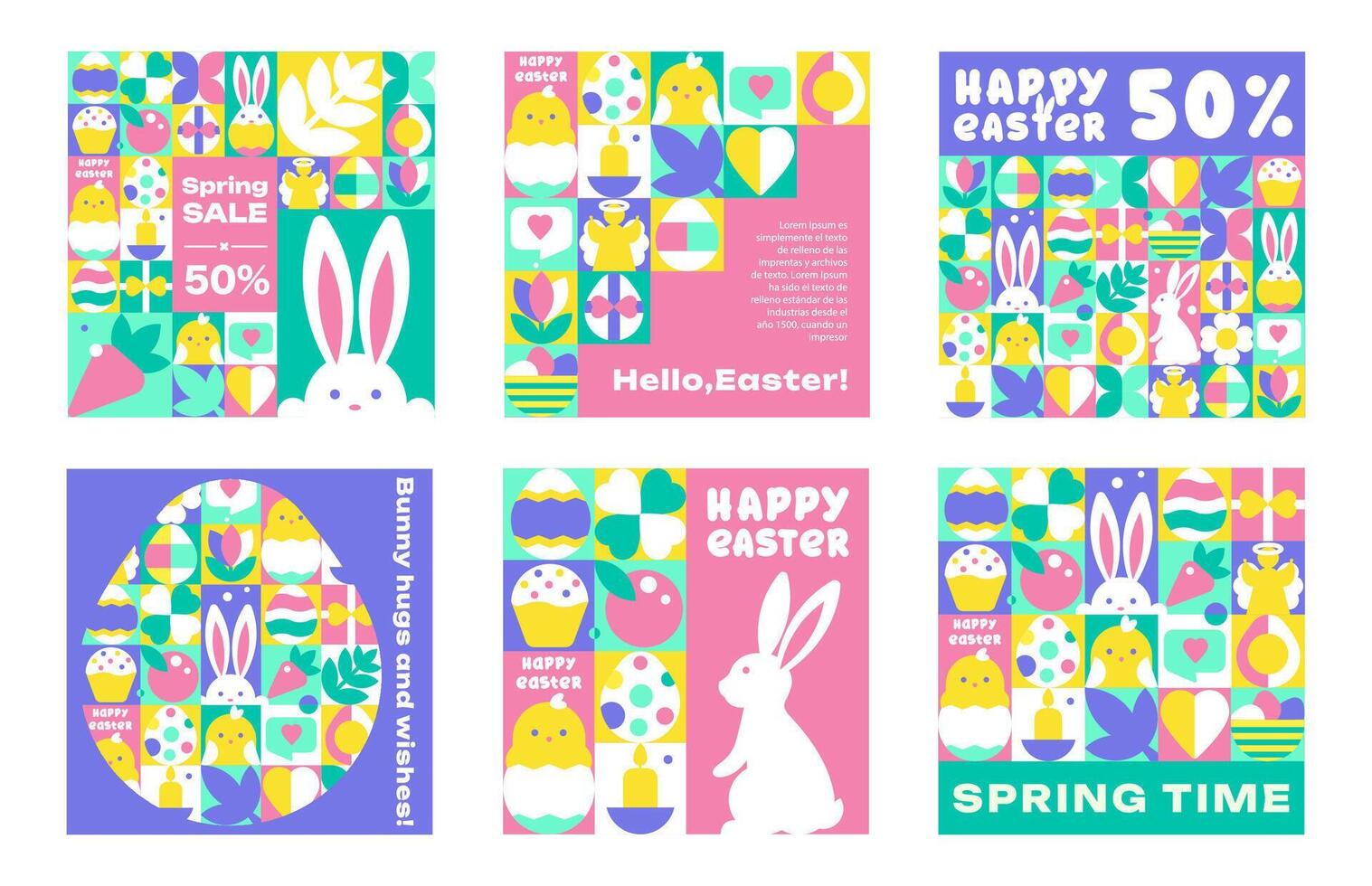 Set of Square Banner Templates with Happy Easter Patterns and Icons in Bauhaus Geometric Style Pro Vector