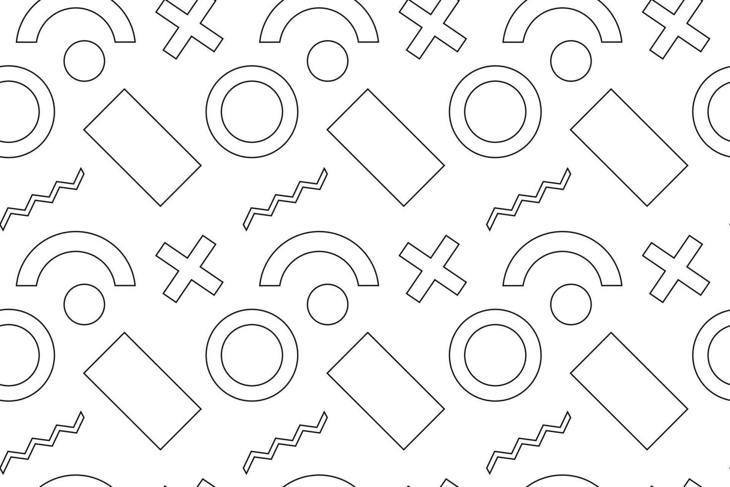 Black and white seamless pattern with circles, arcs, rectangles, crosses, and zigzag lines in a minimalist style. Pro Vector