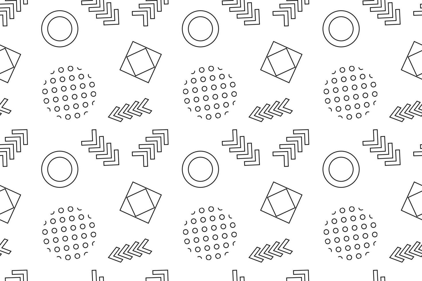 Monochrome seamless pattern featuring dotted circles, squares, arrows, and geometric lines in a clean design. Pro Vector