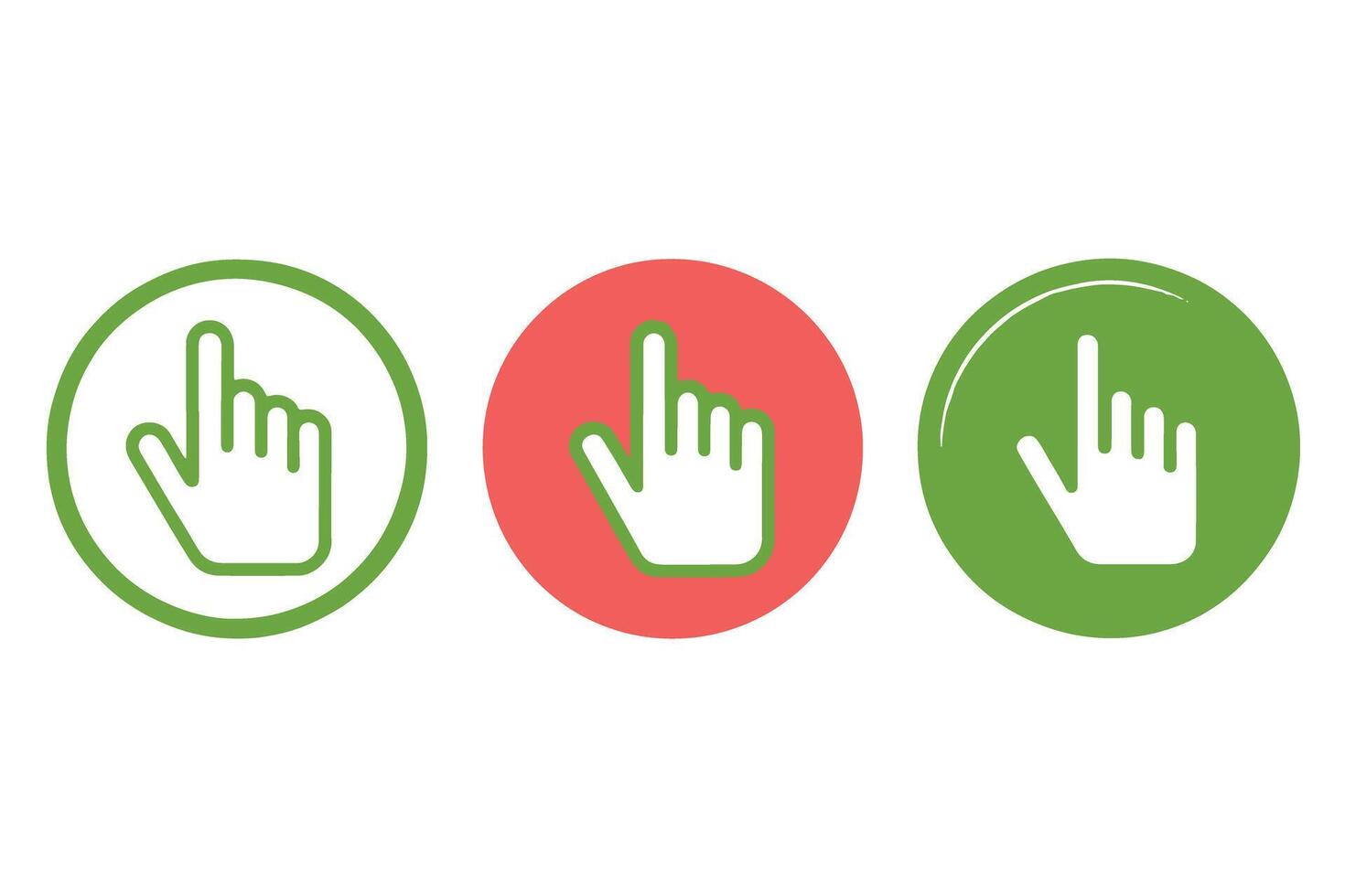 Circular click icons in red, green, and blue with outlined hand symbols, ideal for indicating selection or interaction in UI UX design vector
