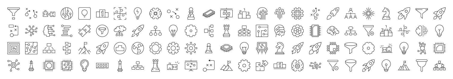 Data and Analytics Simple Linear Illustrations. Contains Icons of Puzzle, Funnel, Gear, Cogwheel, Spaceship that Can Be Used for Design of Cards, Posts, Apps, Web Sites Pro Vector