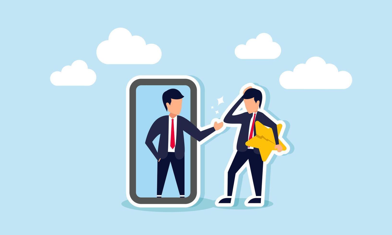 A businessman holding a broken star reflects in a mirror, greeted by a shadow, illustration of gaining motivation from self-reflection on despair in improving business product quality Pro Vector