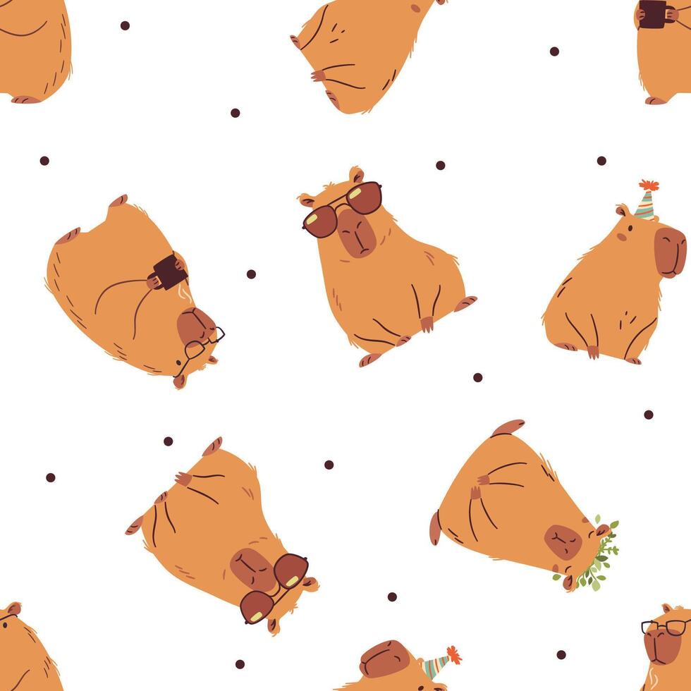 Seamless pattern in a simple childish style. Cute capybaras in different poses Pro Vector