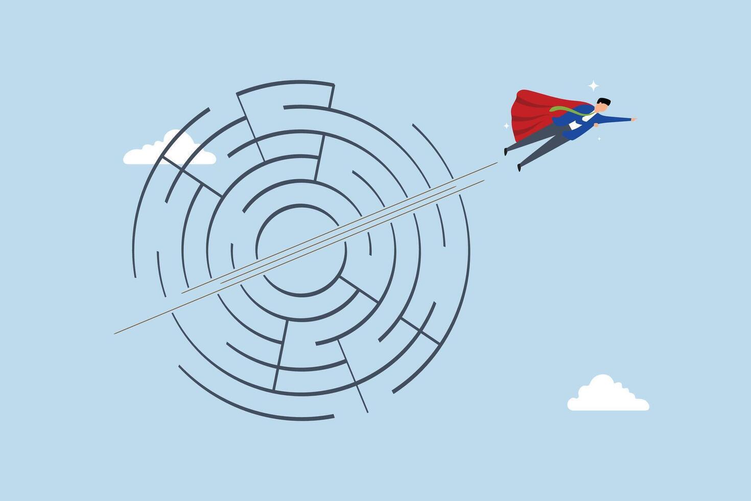 Breakthrough obstacle, entrepreneur hero soaring innovation challenging puzzle complex. Pro Vector