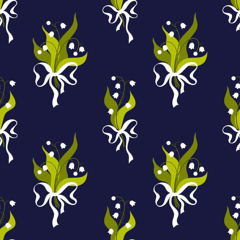 Seamless pattern with bouquets of white spring flowers on a dark blue background. Flat background design. Repeating print for fabric, wrapping paper, textile, wallpaper Pro Vector