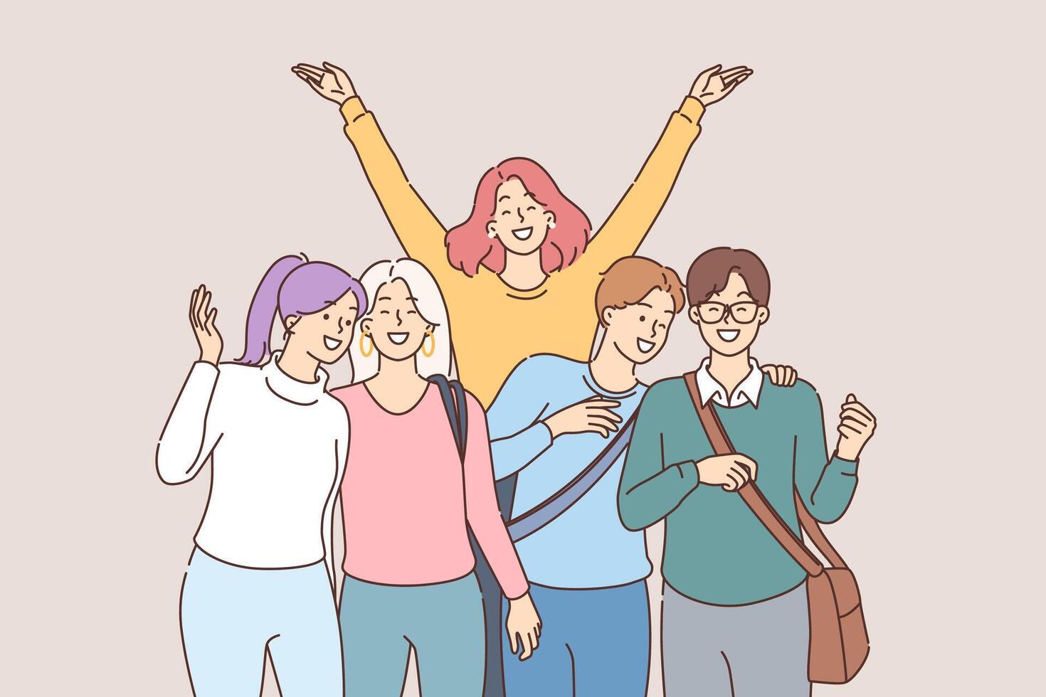 Group of happy students happily pose for group portrait after finishing lecture at university Pro Vector