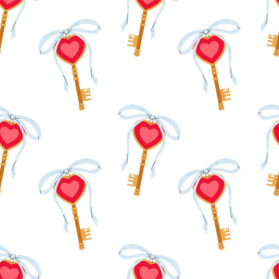 Golden key with bow and heart. Valentine's Day seamless pattern for textile, wrapping paper, background. Pro Vector