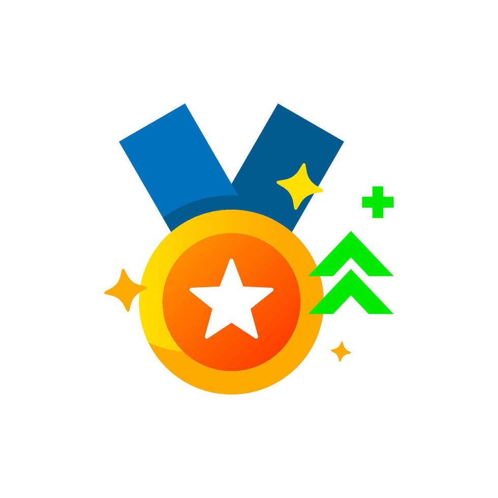Flat illustration of a medal necklace with upward arrow. user level up in an application or website. for depicting achievements, rewards, progress, or unlocking new benefits in gamification systems Pro Vector