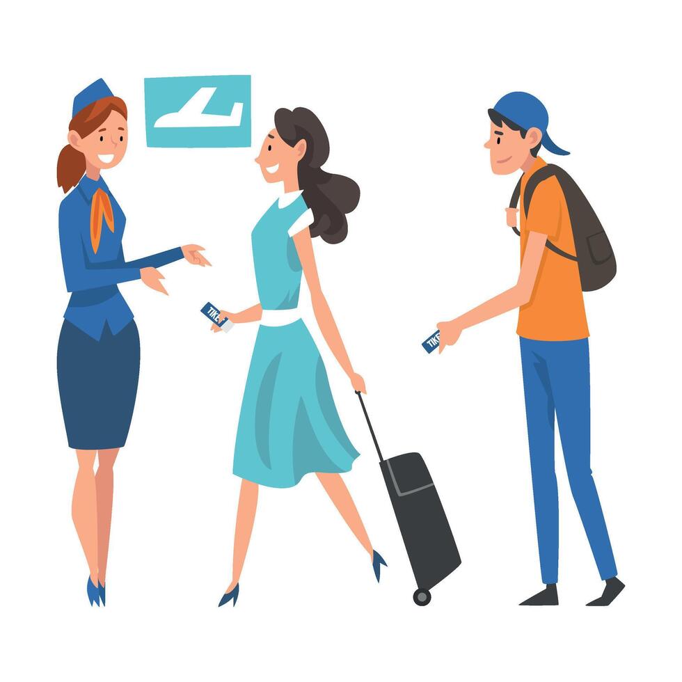 Passengers in Queue Waiting Check at Airport, Airline Representative Checking Ticket Documents Illustration Pro Vector