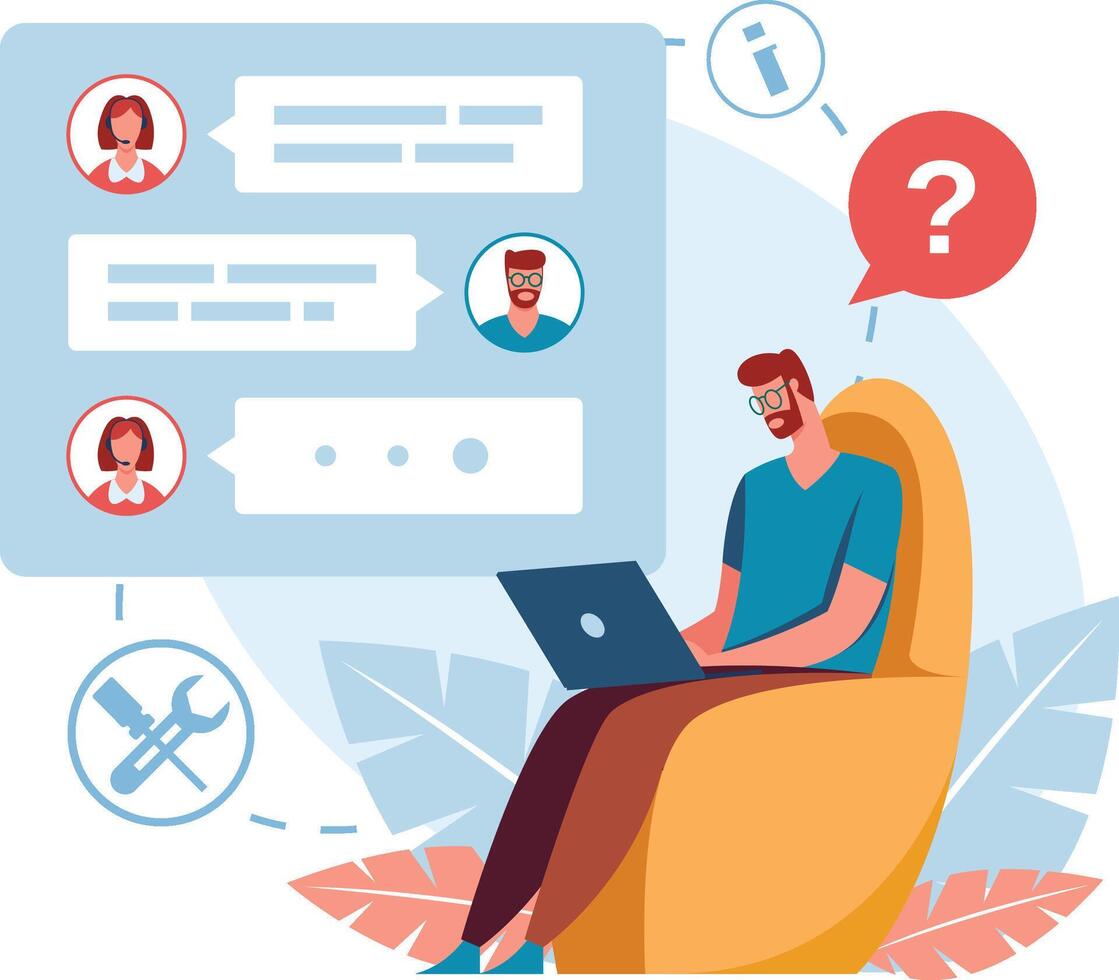 Customer sitting in armchair and using laptop is chatting with customer service, asking question and receiving technical support from operators Pro Vector