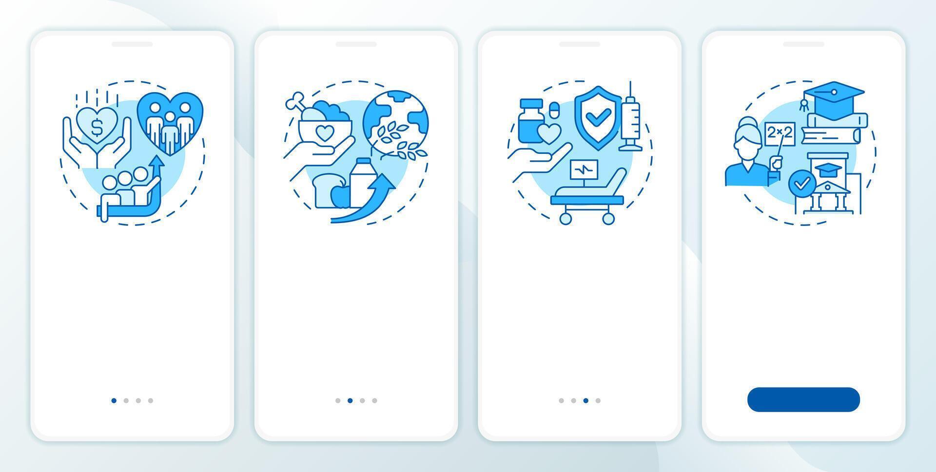 Society development blue onboarding mobile app screen. Walkthrough 4 steps editable graphic instructions with linear concepts. UI, UX, GUI template Pro Vector