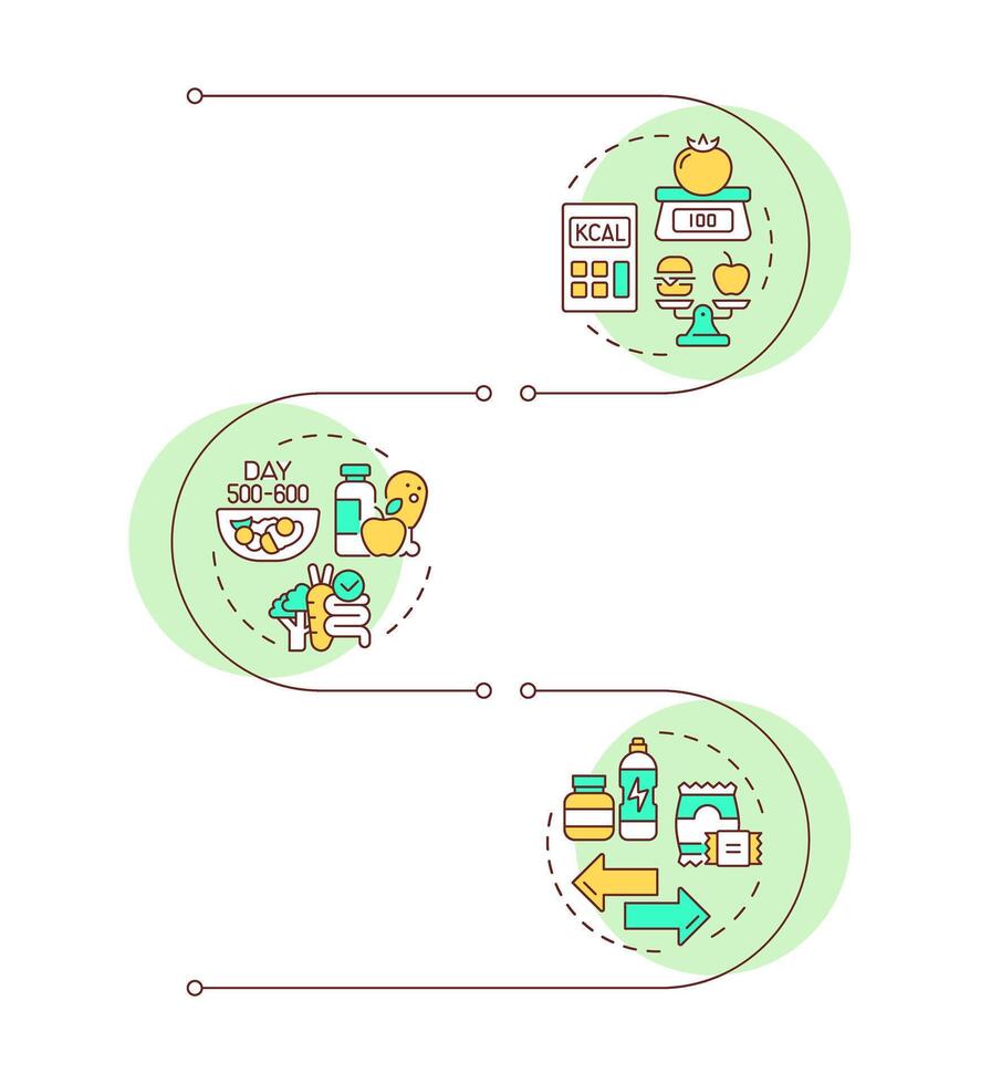 Diet program organization infographic vertical sequence. Calorie quality, healthy nutrition. Visualization infochart with 3 steps. Circles workflow Pro Vector