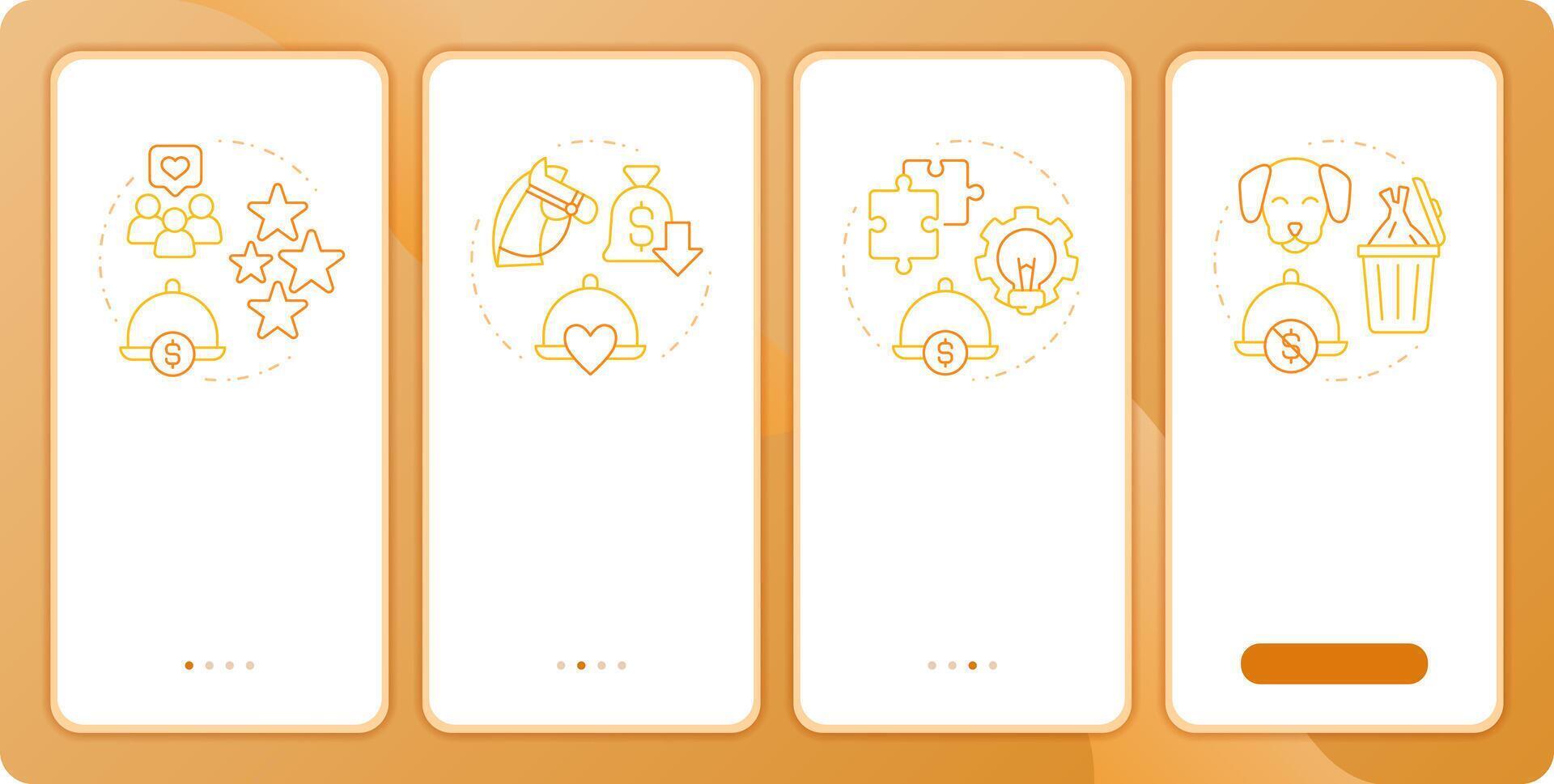 Menu engineering matrix app onboarding screens. Restaurant. Duo tone illustration. UI design flow. 4 steps walkthrough mobile interface slide layout Pro Vector