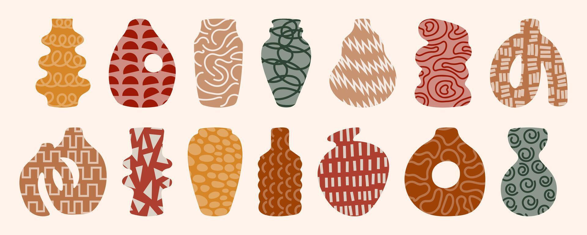 Abstract vases silhouette set with various doodle hand drawn geometric objects, patterns, textures. Handmade ceramic pots of bizarre shapes. Pottery illustration, trendy minimalist style. Pro Vector