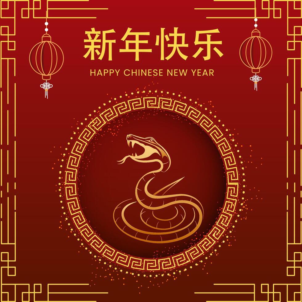 Golden Happy New Year Written Text in Chinese Language with Zodiac Snake Circular Frame, Lanterns Hang on Red and Golden Background. Pro Vector