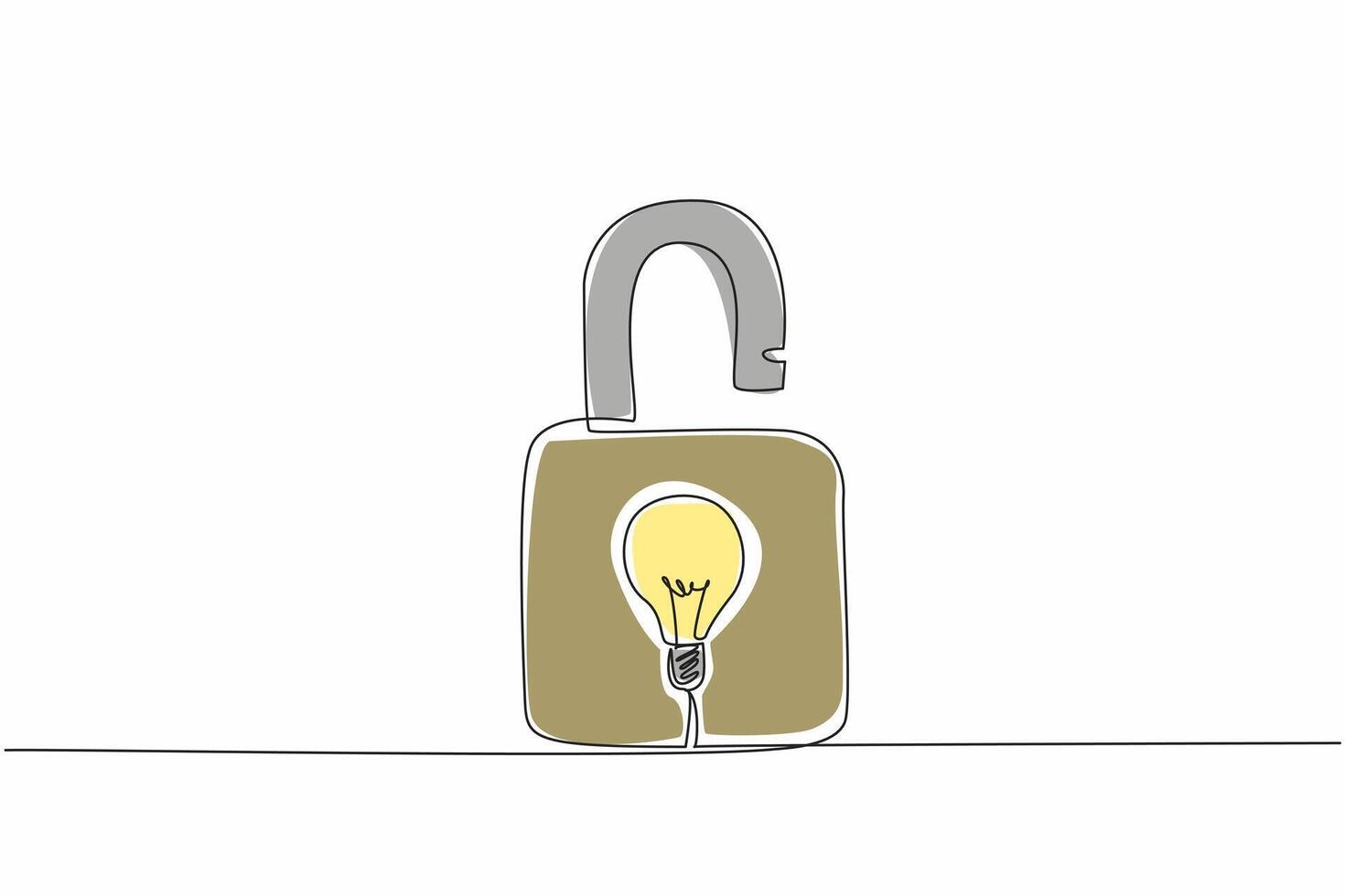Continuous one line drawing a padlock with a light bulb in the middle. Works originating from ideas protected by patents. World Intellectual Property Day. Single line draw design illustration Pro Vector