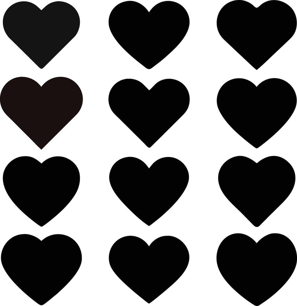 A grid pattern of twelve solid black heart shapes, perfect for graphic design, web design, or other digital projects. Free Vector