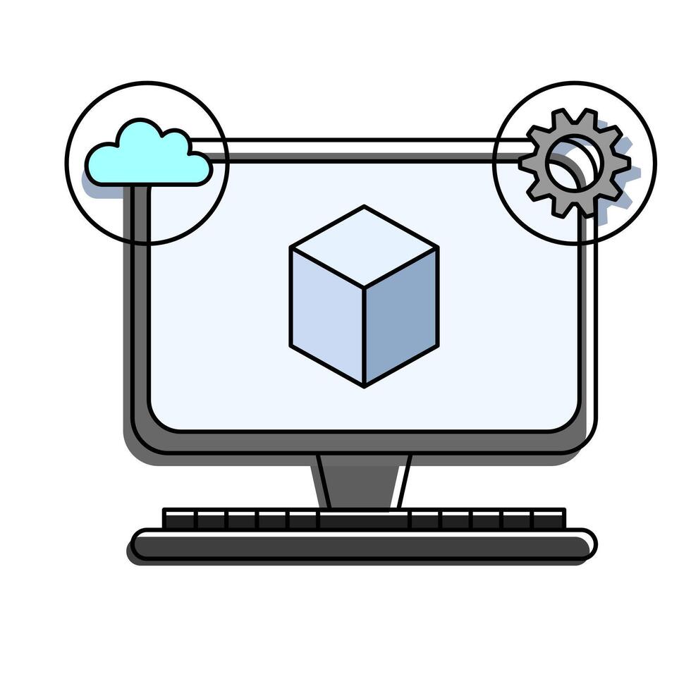 Virtual machine VM, a computer screen showing cubes, cloud icons, and gear icons. Concepts related to virtualization, cloud computing, and virtual machine management in the IT field. Pro Vector