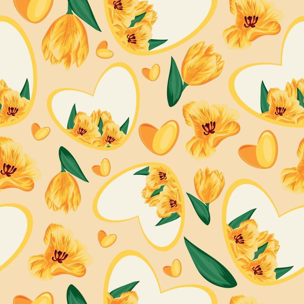 seamless pattern with hearts with floral design namely yellow tulip of different sizes, hearts and tulip petals on a yellow background vector