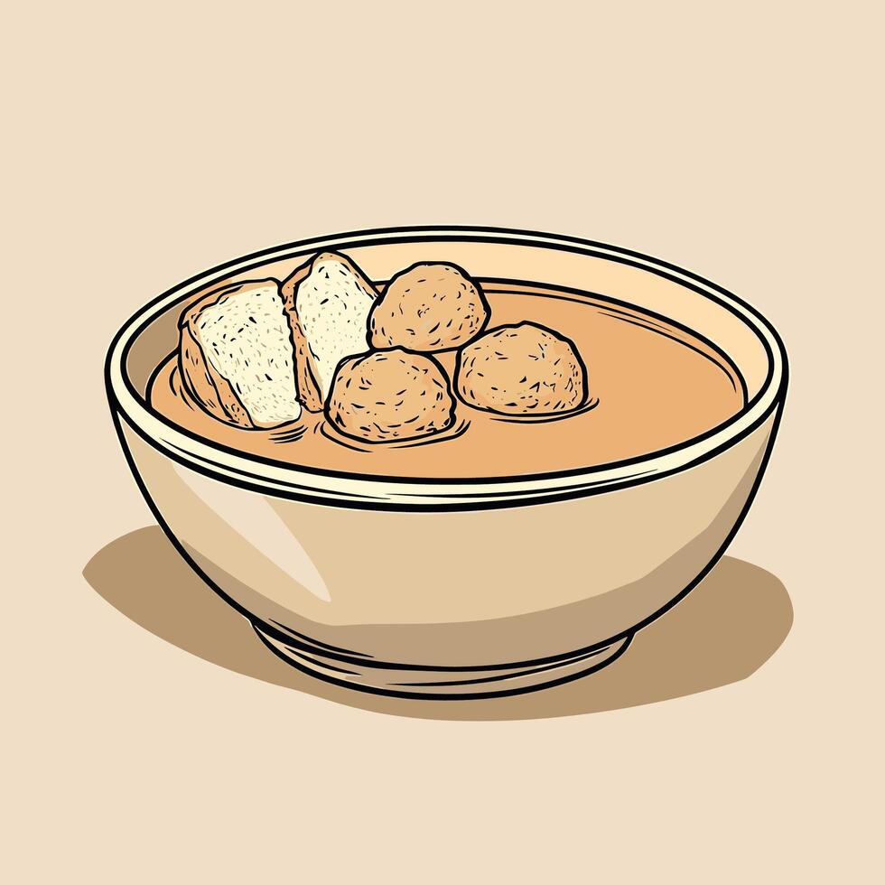 Rustic Bowl of Soup with Bread on Beige Background Pro Vector
