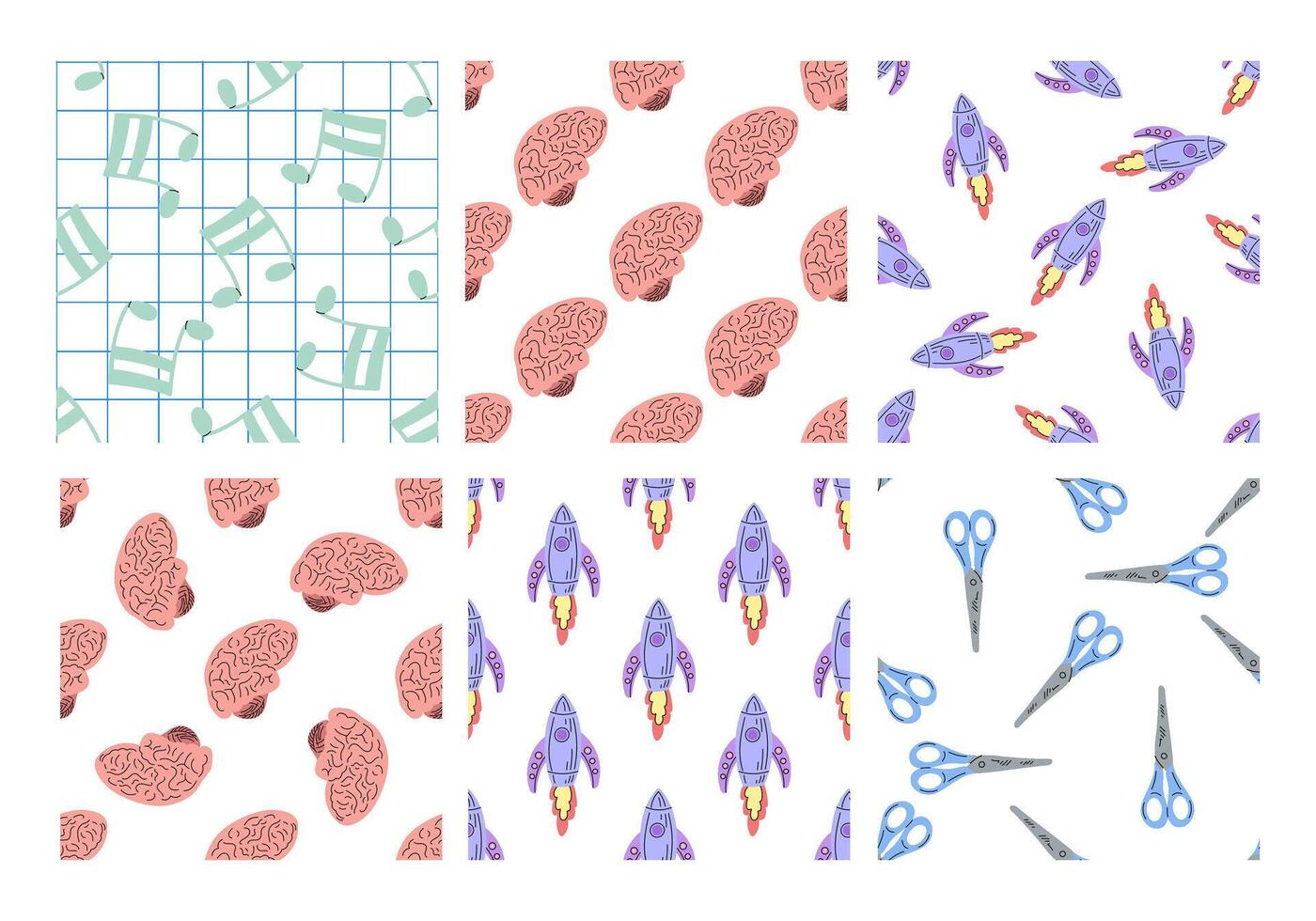 Set of seamless patterns with music notes, brains and rockets in flat style Pro Vector