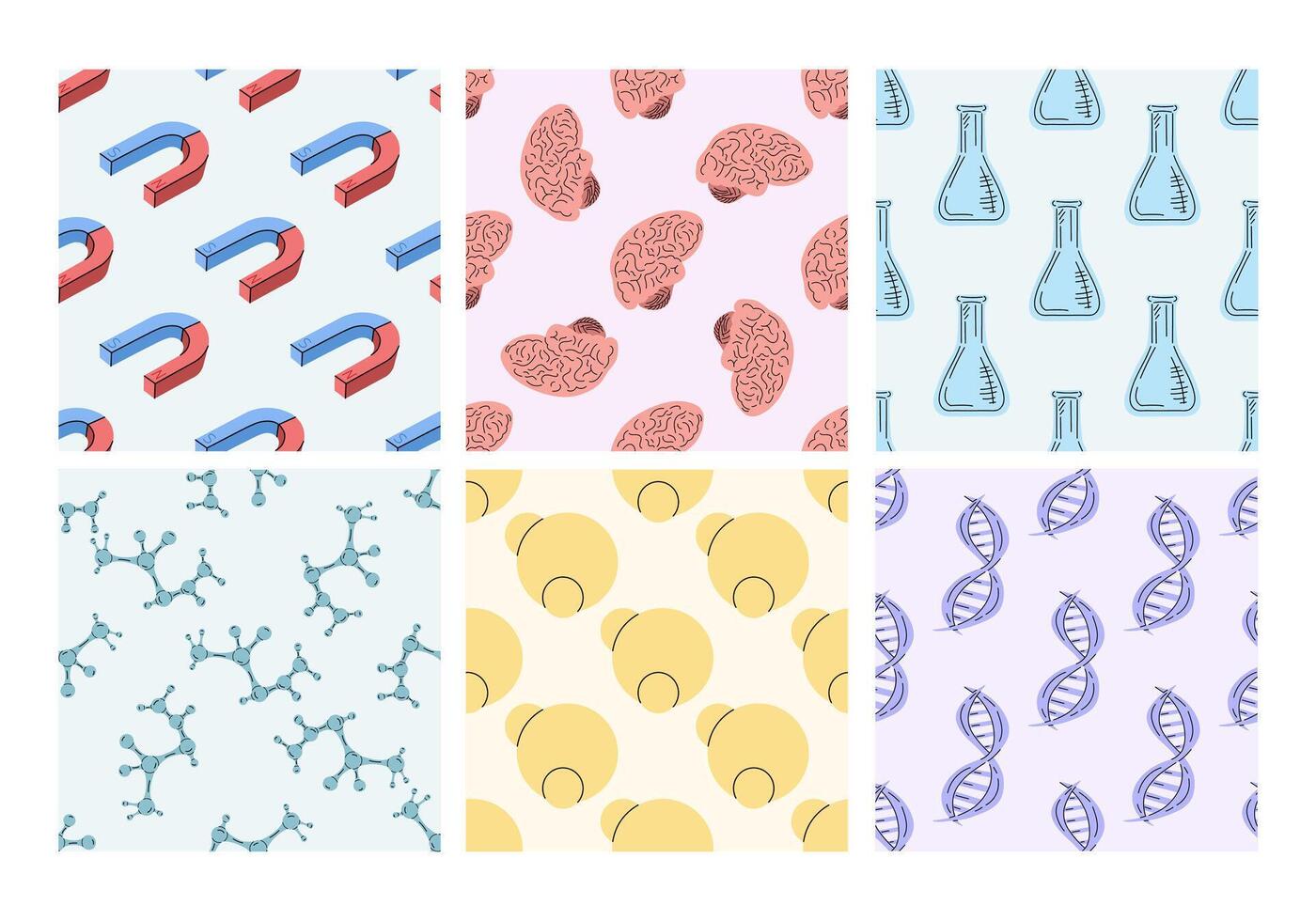 Set of seamless patterns with science and education symbols in flat style Pro Vector