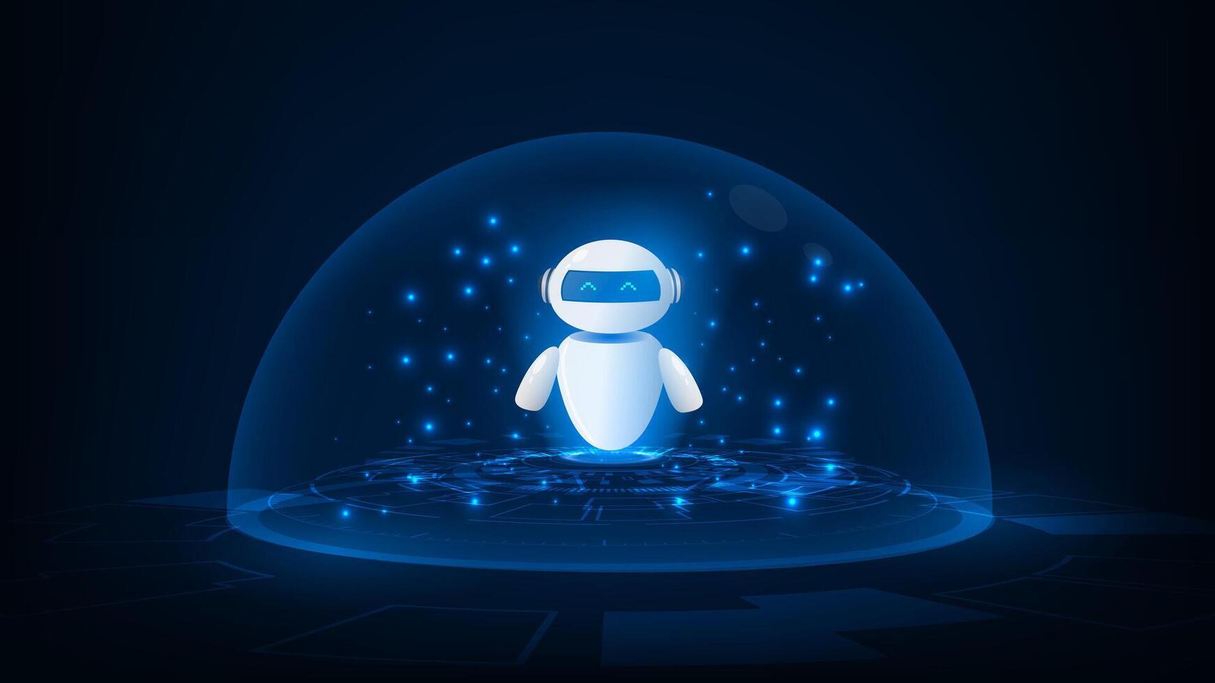 AI roboot in blue bubble over tech circle, chatbot assistant concept for business. Pro Vector
