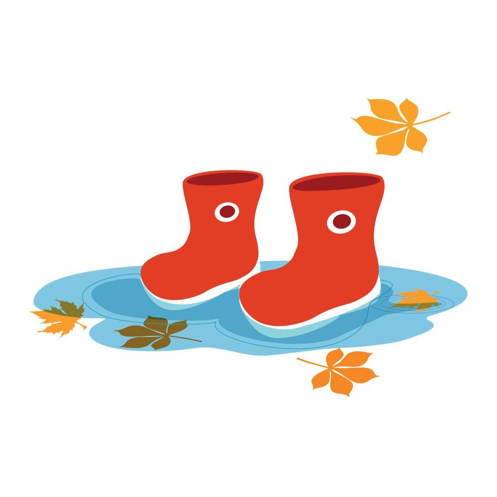 Red children's rubber boots in a puddle. Autumn fun. Square format, isolation on a white background. Use as a sticker, print, card, web networks. Pro Vector
