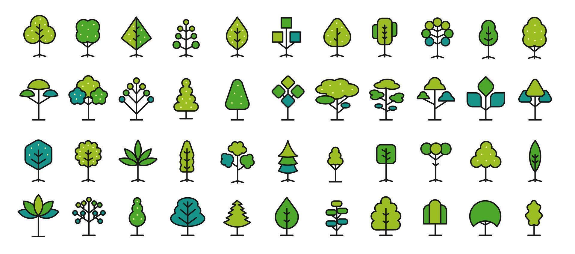 Colourful Flat Tree Icon Set. Minimalist Linear Trees in Modern Geometric Design Pro Vector