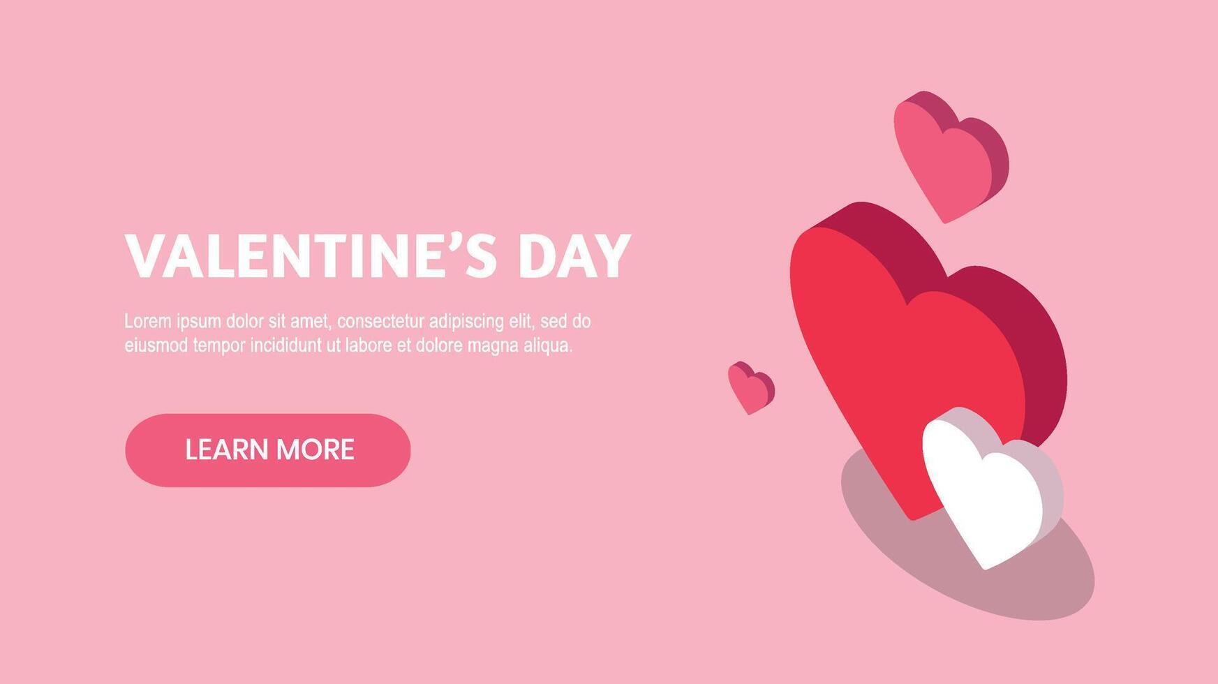 Banner design for Valentine's Day with isometric red, white and pink hearts on pink background. Learn more button for web Pro Vector