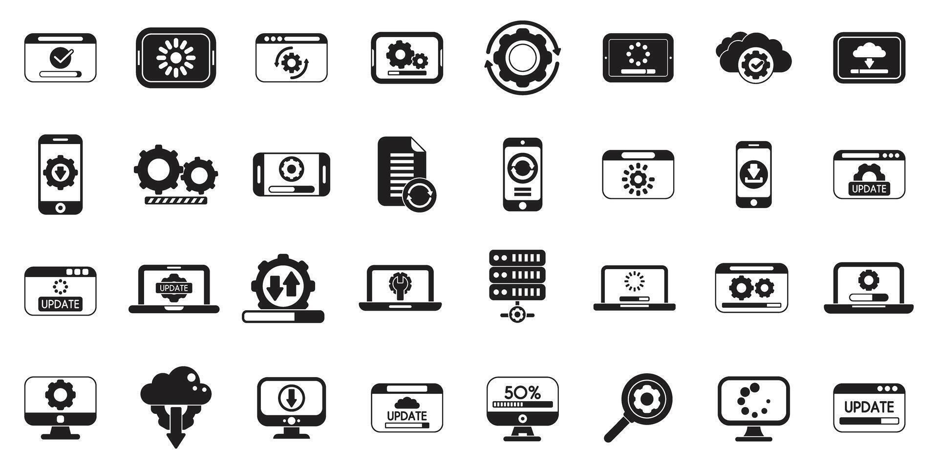 Update app software icons set. Software update progress and settings icons depicting updating process Pro Vector